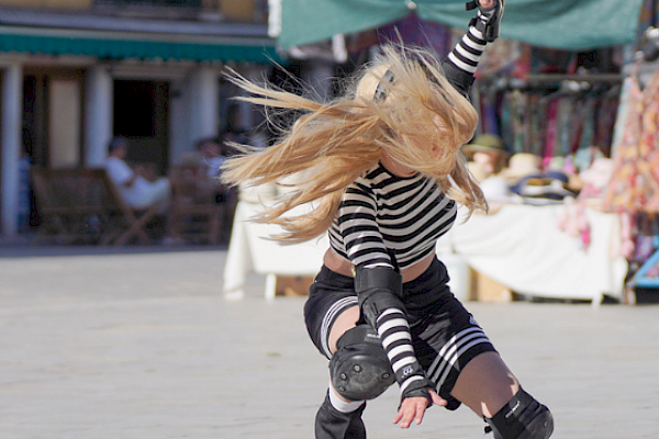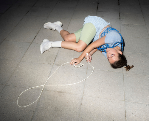 HIT OUT is a choreographic and musical project in which rope jumping is used as a percussive element to express embodied rhythms. The jumpers perform a rhythmic and choreographic score in which single-unders, side-swings and double-unders harmonise in a real hit. The practice of training is elevated to a performative action: the hammering succession of rope strokes echoes the rebellion against those forces that would have us lying motionless on the ground with our eyes closed.